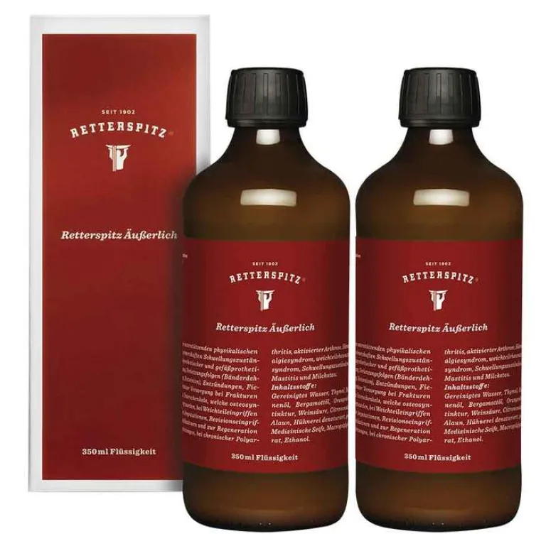 Retterspitz® Äußerlich ist ein Naturmittel, das aus der Gebirgspflanze Arnika und ätherischen Ölen gewonnen wird. Die Lösung wird für physikalische Therapien, wie Wickel, Auflagen oder Nasse Strümpfe verwendet. Dadurch wird die Durchblutung angeregt und Stoffwechselgänge beschleunigt. Typische Anwendungsgebiete umfassen beispielsweise Prellungen, Verstauchungen, Fieber oder Muskelverspannungen.