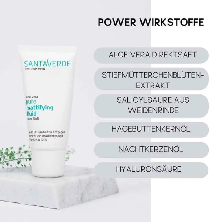 Das mattierende Fluid pflegt die Haut, wirkt Unreinheiten entgegen und beugt ihrer Neuentstehung vor. Reiner Aloe Vera Saft und Hyaluron spenden und binden intensiv Feuchtigkeit und schützen die Hautbarriere. Entzündungshemmender Stiefmütterchenblütenextrakt sowie talgregulierende Salicylsäure aus Weidenrinde wirken verstopften Poren und glänzenden Hautpartien entgegen. Beruhigende Öle aus Nachtkerze und Hagebutte lindern Rötungen und haben einen schützenden Pflegeeffekt. Die feine Textur zieht schnell ein und hinterlässt die sensible, zu Glanz neigende und unreine Haut mattiert, rein und klar.