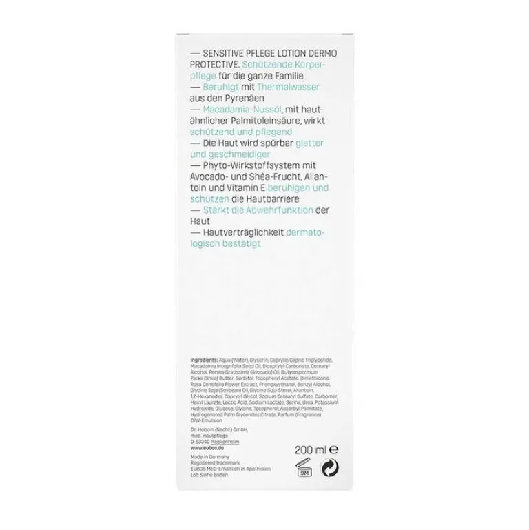 Die Eubos sensitive Pflege Lotion Dermo Protective ist eine schützende Körperpflege für die ganze Familie. Sie beruhigt mit Thermalwasser aus den Pyrenäen. Das enthaltene Macadamia-Nussöl, mit hautähnlicher Palmitoleinsäure, wirkt schützend und pflegend. Die Haut wird spürbar glatter und geschmeidiger. Das Phyto-Wirkstoffsystem mit Avocado- und Shea-Frucht, Allantoin und Vitamin E beruhigt und schützt die Hautbarriere und stärkt die Abwehrfunktion der Haut. Die Hautverträglichkeit wurde dermatologisch bestätigt.