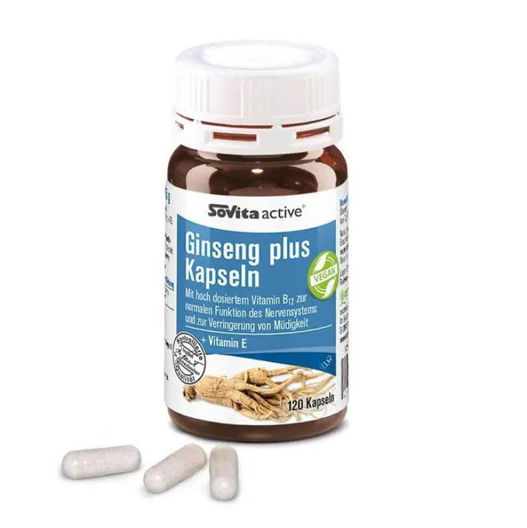 Ginseng plus Kapseln enthalten einen wertvollen Ginseng-Extrakt – kombiniert mit natürlichem Vitamin E und Vitamin B12. Vitamin E schützt die Zellen vor oxidativem Stress, während Vitamin B12 zur Verringerung von Müdigkeit und Ermüdung beiträgt und die normale Funktion des Nervensystems unterstützt.