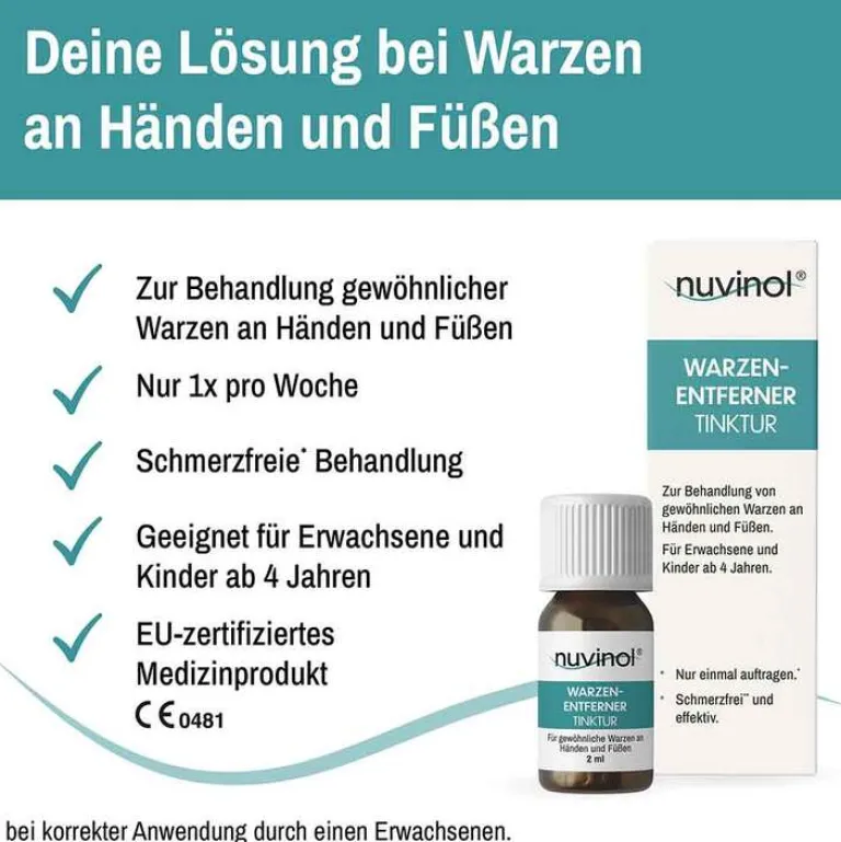 Unsere Warzentinktur ist ein EU-zertifiziertes Medizinprodukt. Sie wurde speziell für die gezielte Behandlung gewöhnlicher Warzen an Händen und Füßen entwickelt. Der enthaltene Wirkstoff löst die Warze sanft Schicht für Schicht ab. Die Nuvinol Warzenentferner Tinktur bietet eine schmerzfreie* Lösung und ist bereits für Kinder ab 4 Jahren geeignet.