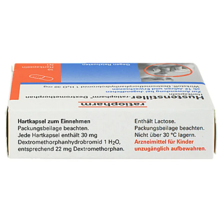 - 1 Kapsel Hustenstiller-ratiopharm Dextromethorphan (entsprechend 30 mg Dextromethorphanhydrobromid 1 H2O) alle 6 Stunden.