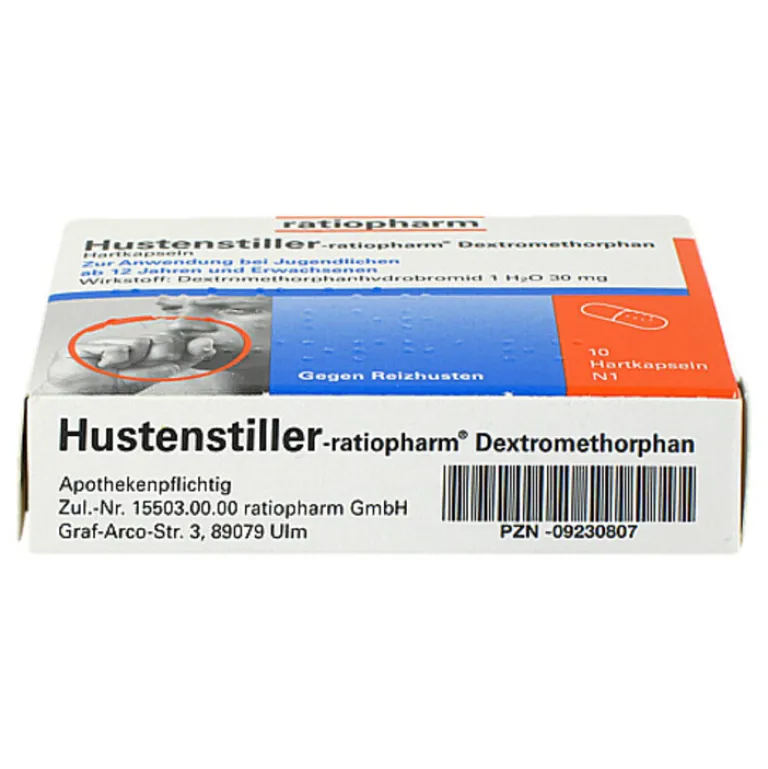 Hustenstiller-ratiopharm® Dextromethorphan.Wirkstoff: Dextromethorphanhydrobromid 1 H2O. Anwendungsgebiete: Symptomatische Behandlung des Reizhustens (unproduktiver Husten). Warnhinweis: AM enth. Lactose! Apothekenpflichtig. Zu Risiken und Nebenwirkungen lesen Sie die Packungsbeilage und fragen Sie Ihre Ärztin, Ihren Arzt oder in Ihrer Apotheke. 3/21.
