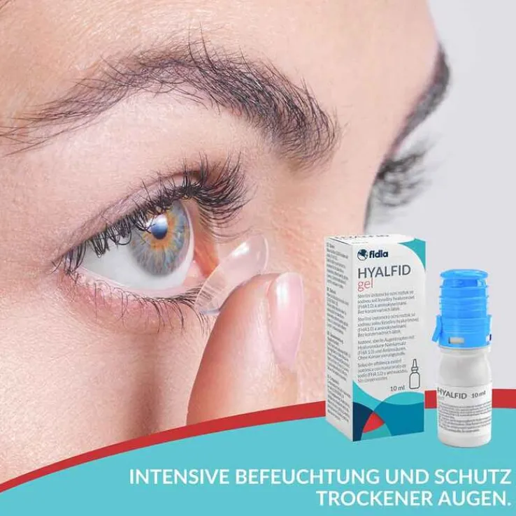 HYALFID Gel ist eine sterile, konservierungsmittelfreie Lösung zur Anwendung am Auge, speziell entwickelt, um auch in den schwersten Fällen die Augenoberfläche zu schützen und zu befeuchten. Die Augentropfen enthalten 0,30 % Hyaluronsäure (FHA 1.0) sowie eine sorgfältig abgestimmte Kombination von Aminosäuren. Dank der höheren Konzentration von Hyaluronsäure ist HYALFID Gel besonders für intensive Anwendungen, bei denen eine stärkere und länger anhaltende Feuchtigkeit benötigt wird, geeignet. HYALFID Gel wird in einer innovativen OSD-Tropfvorrichtung (Ophthalmic Squeeze Dispenser) angeboten, die dank ihres mehrschichtigen Luftfilter- und Tip-Seal-Ventilsystems die Sterilität des Produkts ohne Konservierungsmittel gewährleistet.