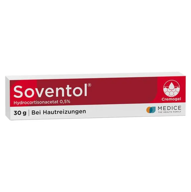 Soventol® Hydrocortisonacetat 0,5% 5 mg/g Creme. Anwendungsgebiete: Zur Behandlung von mäßig ausgeprägten geröteten, entzündlichen oder allergischen Hauterkrankungen, bei denen schwach wirksame, niedrig konzentrierte Corticosteroide angezeigt sind. Warnhinweise: Keine Anwendung bei Kindern unter 6 Jahren ohne ärztliche Verordnung. Zu Risiken und Nebenwirkungen lesen Sie die Packungsbeilage und fragen Sie Ihre Ärztin, Ihren Arzt oder in Ihrer Apotheke. Stand 07/2022. MEDICE Arzneimittel, 58638 Iserlohn