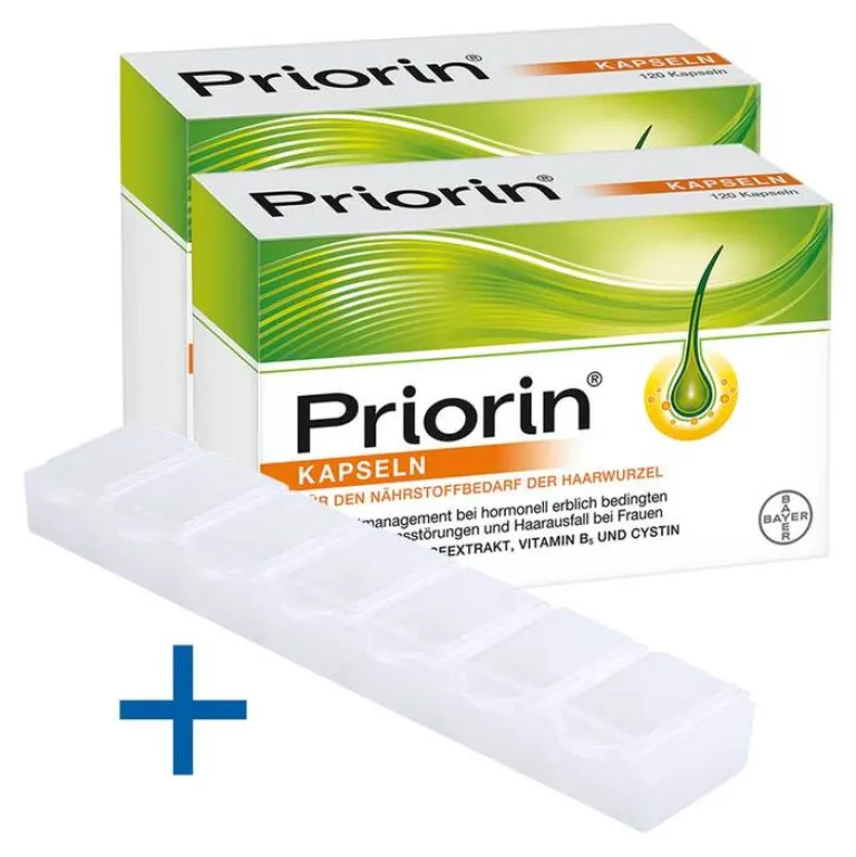 Priorin® Kapseln sind zum Diätmanagement bei hormonell erblich bedingtem Haarausfall und Haarwachstumsstörungen bei Frauen bestimmt. Mit ihrer natürlichen 3-fach-Formel aus Hirseextrakt, Vitamin B5 und L-Cystin stärken die Priorin® Kapseln die Haarwurzeln von innen und sorgen für mehr Haarwachstum sowie kräftigeres Haar. Bereits nach 12 Wochen konnten Frauen, die Priorin® Kapseln einnahmen, eine Steigerung der Anzahl der Haare in der Wachstumsphase feststellen.1 Die Anwendung erfolgt dabei ganz einfach – bei Haarausfall morgens zwei und abends eine Kapsel einnehmen, bei leichteren Haarwachstumsstörungen eine Kapsel täglich einnehmen.