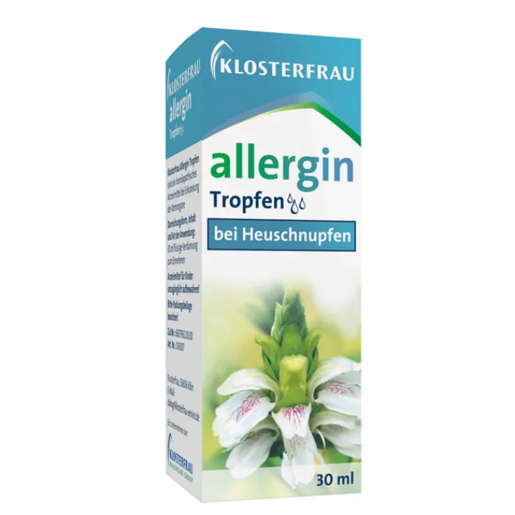 Klosterfrau® allergin Tropfen. Wirkstoff: Adhatoda vasica Dil. D2. Anwendungsgebiete: Klosterfrau® allergin Tropfen werden entsprechend den homöopathischen Arzneimittelbildern angewendet. Dazu gehört: Heuschnupfen. Hinweis: Wenn der Heuschnupfen länger andauert, sollte, wie bei allen unklaren Beschwerden, ein Arzt aufgesucht werden, da es sich um Erkrankungen handeln kann, die einer ärztlichen Behandlung bedürfen. Warnhinweis: Enthält 70 Vol.-% Alkohol. Packungsbeilage beachten. Zu Risiken und Nebenwirkungen lesen Sie die Packungsbeilage und fragen Sie Ihre Ärztin, Ihren Arzt oder in Ihrer Apotheke.