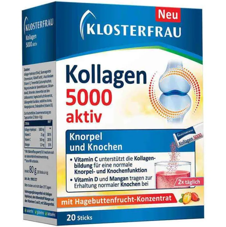 Mit der Zeit oder wenn Knorpel und Knochen durch häufige körperliche Aktivität oder einseitige Belastungen stärker beansprucht werden als früher, bekommt die Erhaltung der Gesundheit der Knorpel und Knochen eine hohe Priorität. Klosterfrau Kollagen 5000 aktiv bietet dank Vitamin C, D und Mangan eine tägliche Unterstützung für eine normale Funktion der Knorpel und Knochen*.