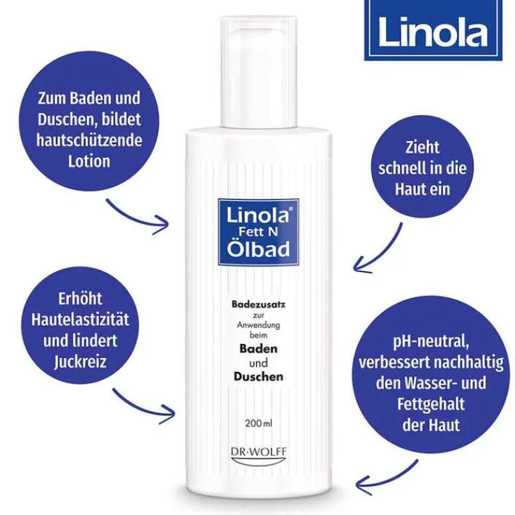 Durch jeden Kontakt mit Wasser und nicht nur durch Seife, Shampoos usw. wird die Haut entfettet. Die Folge ist eine beschleunigte Austrocknung der Haut und die Rauigkeit, die Bildung von Schuppen und Einrissen sowie Juckreiz nehmen zu. Durch Anwendung von Linola Fett N Ölbad beim Baden oder Duschen lassen sich diese Probleme vermeiden.