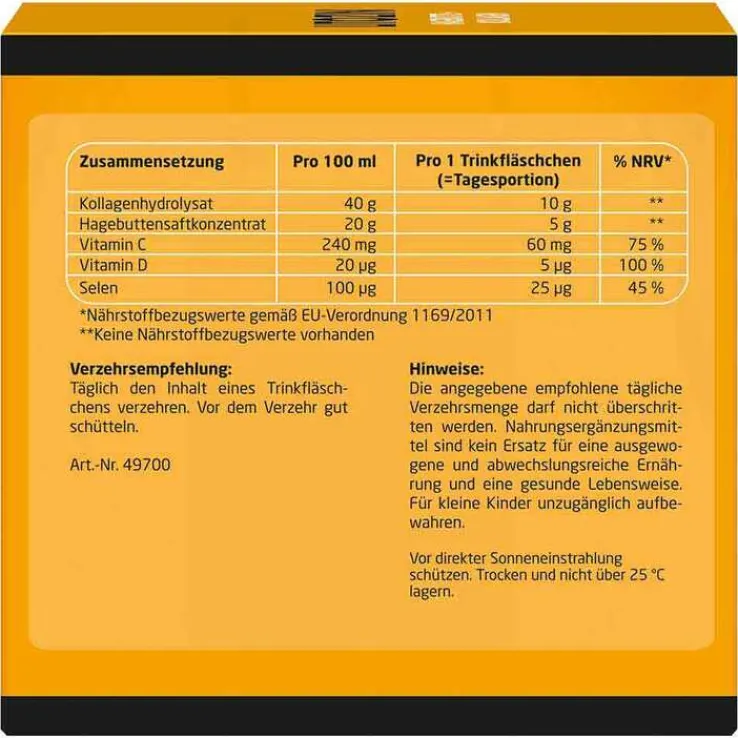 Kollagenhydrolysat 40 %, Wasser, Hagebuttensaftkonzentrat 20 %, Fructose, Orangensaftkonzentrat, L-Ascorbinsäure, Natriumselenat, Konservierungsstoffe Kaliumsorbat und Natriumbenzoat, natürliches Aroma, Cholecalciferol