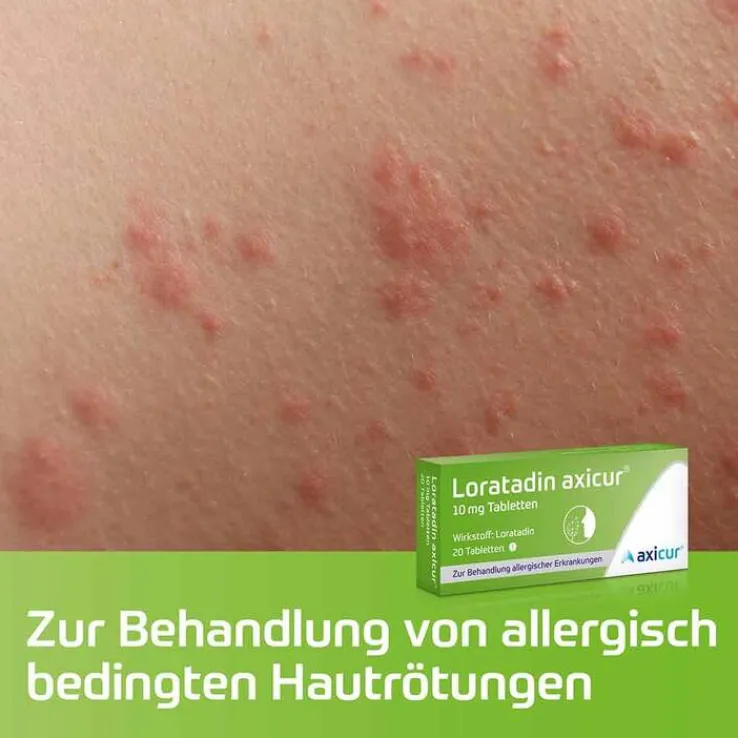 Loratadin axicur® 10 mg Tabletten. Anwendungsgebiete: Zur Linderung der Symptome bei allergischer Rhinitis (z. B. Heuschnupfen) wie Niesen, laufende oder juckende Nase und brennende oder juckende Augen bei Erwachsenen und Kindern über 2 Jahren mit einem Körpergewicht von mehr als 30 kg. Zur Linderung von Symptomen bei Urtikaria (Nesselsucht) wie Juckreiz, Hautrötung sowie Anzahl und Größe der Quaddeln. Enthält Lactose. Packungsbeilage beachten. Zu Risiken und Nebenwirkungen lesen Sie die Packungsbeilage und fragen Sie Ihren Arzt oder Apotheker. axicorp Pharma GmbH, 61381 Friedrichsdorf. Stand: April 2022