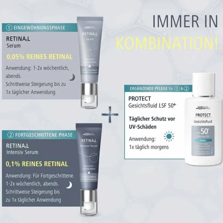 Retinal kann die Lichtempfindlichkeit der Haut erhöhen, was bedeutet, dass die Haut nach der Anwendung besonders anfällig für UV-Schäden ist. Um die optimale Wirkung der Retinal Seren zu gewährleisten und gleichzeitig die Haut vor den schädlichen Auswirkungen der Sonnenstrahlung zu schützen, ist der tägliche Gebrauch des Protect Gesichtsfluids unerlässlich. Hierfür sollten die Seren ausschließlich am Abend aufgetragen und das Gesichtsfluid am nächsten Morgen angewandt werden.