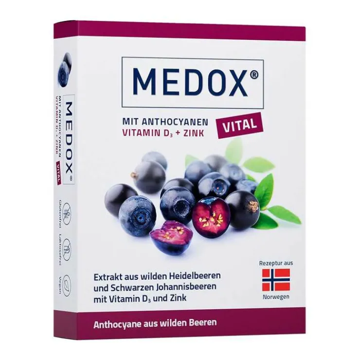 Medox Vital kombiniert als Nahrungsergänzungsmittel wertvolle Anthocyane aus wildwachsenden, skandinavischen Heidelbeeren und schwarzen Johannisbeeren mit Vitamin D3 plus Zink. Mit dieser Kombination unterstützt es die normale Funktion des Immunsystems* – und damit unser Schutzschild gegen Erkältungen und Co.