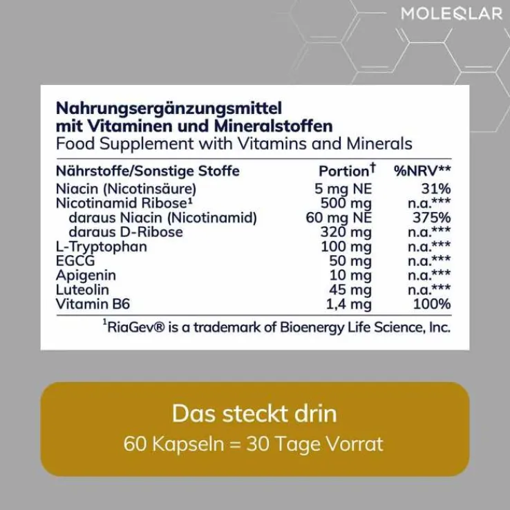 - Enthält NAD-Vorstufen, -Abbauhemmer und -Aktivierungsenzyme