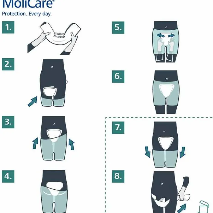 MoliCare® Form Produkte gibt es in 4 Saugstärken von 4, 5, 6 und 8 Tropfen und sind geeignet für leichte bis schwere Stuhl- und Harninkontinenz. Die einzigartigen, anatomisch geformten Produkte haben einen Aufsaug-Kanal, der Flüssigkeit schnell aufnimmt und sicher im Produkt bindet. Für zusätzliche Sicherheit sorgen flüssigkeitsabweisende Innenbünchen. Die Produkte sind pH-hautneutral und schützen auf einzigartige Weise vor Hautreizungen im Intimbereich. MoliCare® Form ist bei mobilen und bettlägrigen Personen einfach anzulegen. Für einen sicheren Sitz wird das Tragen mit elastischen Hosen empfohlen, wie MoliCare® Premium Fixpants, die bis zu 50 mal waschbar sind.