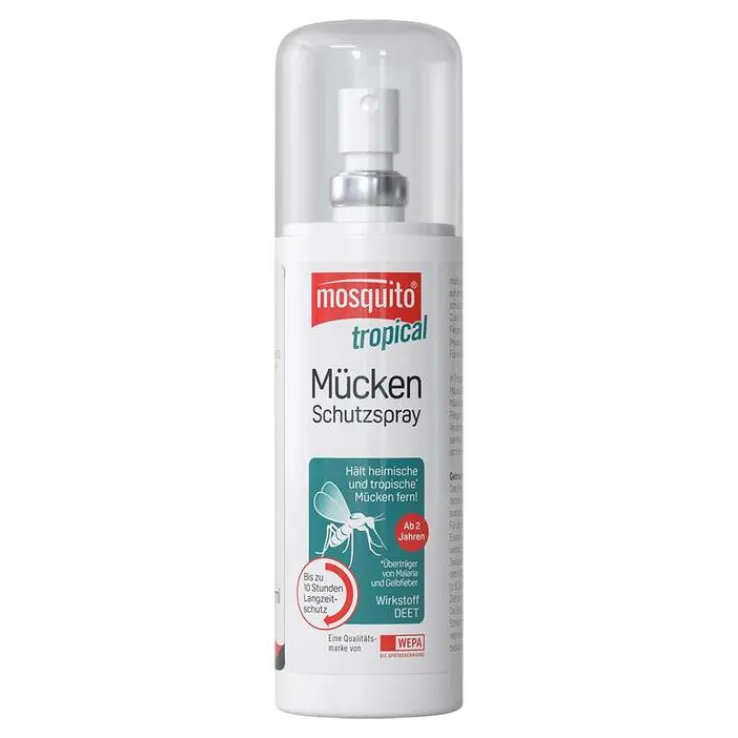 Für Fernreisen und Tropen. Denn tropische Mückenarten wie die Anopheles-Mücke oder die Asiatische Tigermücke können zum Teil ernsthafte Erkrankungen wie Malaria oder Gelbfieber übertragen. Das mosquito® tropical Mücken-Schutzspray sollte hier nicht in der Reiseapotheke fehlen.
