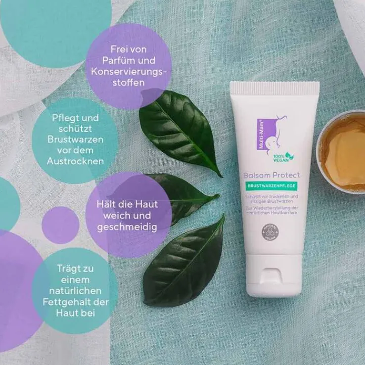 Der vegane Brustwarzen-Balsam Multi-Mam Balsam Protect basiert hauptsächlich auf pflanzlichen Ölen und Fetten und schützt die Brustwarzen während des Stillens optimal vor Trockenheit und Rissen.
