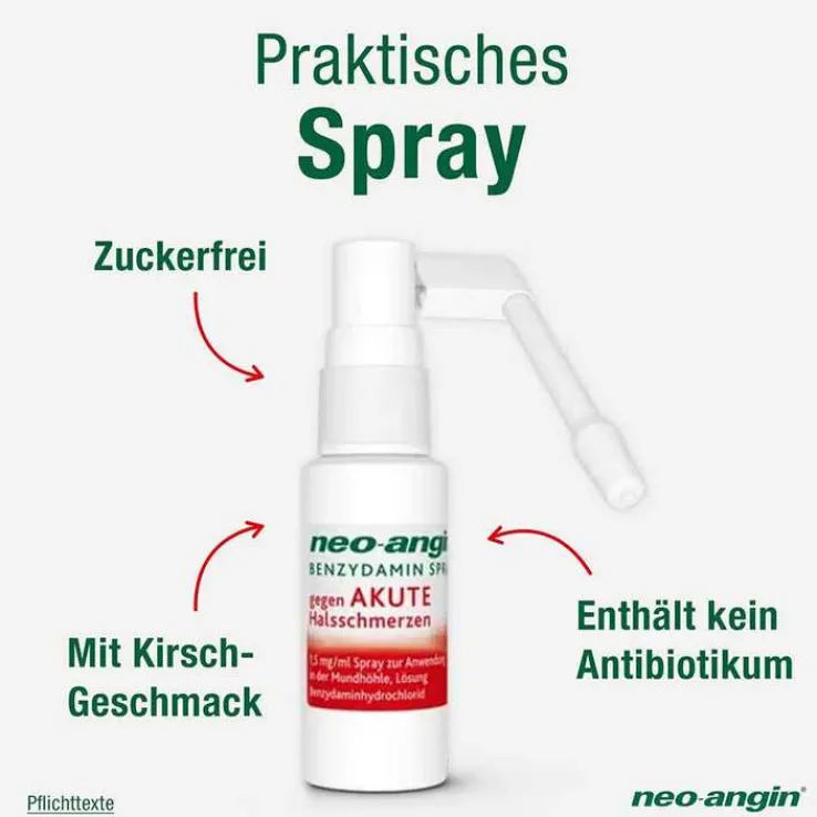 neo-angin® Benzydamin Spray gegen akute Halsschmerzen. Wirkstoff: Benzydaminhydrochlorid. Anwendungsgebiete: neo-angin® Benzydamin Spray gegen akute Halsschmerzen wird angewendet bei Erwachsenen und Kindern ab 6 Jahren zur symptomatischen, lokalen Behandlung von akuten Halsschmerzen, die mit den typischen Entzündungssymptomen wie Schmerzen, Rötung oder Schwellung im Mund- und Rachenraum einhergehen. Zu Risiken und Nebenwirkungen lesen Sie die Packungsbeilage und fragen Sie Ihre Ärztin, Ihren Arzt oder in Ihrer Apotheke.