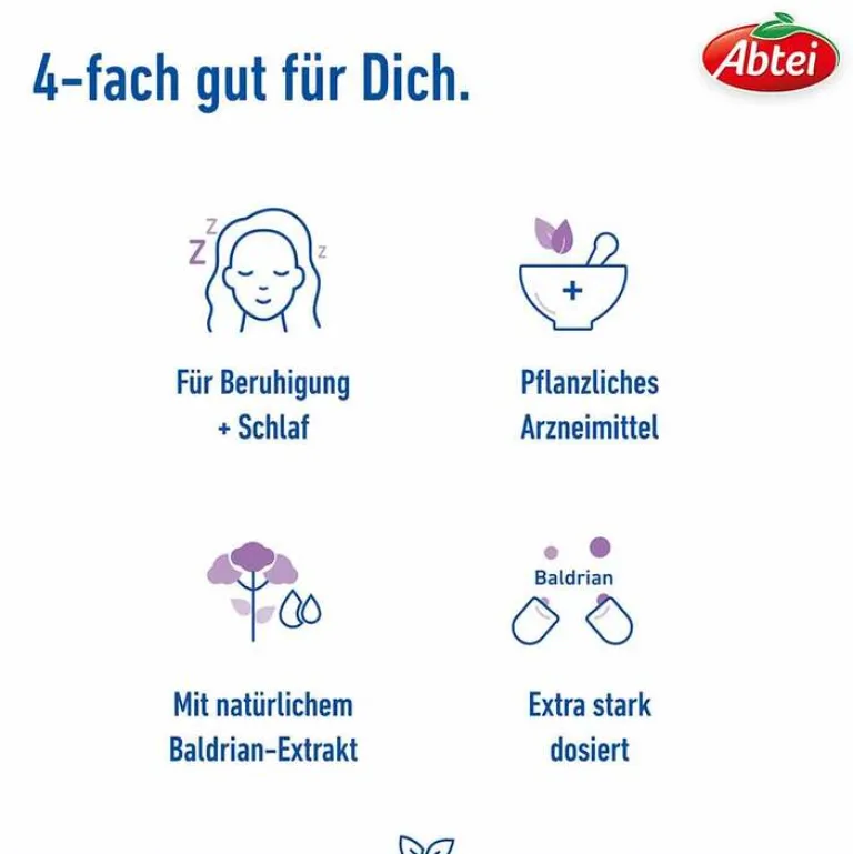 Hohe Belastungen im privaten oder beruflichen Alltag können zu Überforderung, nervöser Anspannung oder Schlafstörungen führen. Abtei Baldrian Forte Beruhigungsdragees schaffen Abhilfe – sie wirken entspannend und beruhigen die Nerven. Für Ruhe und Gelassenheit am Tag und erholsamen Schlaf in der Nacht.