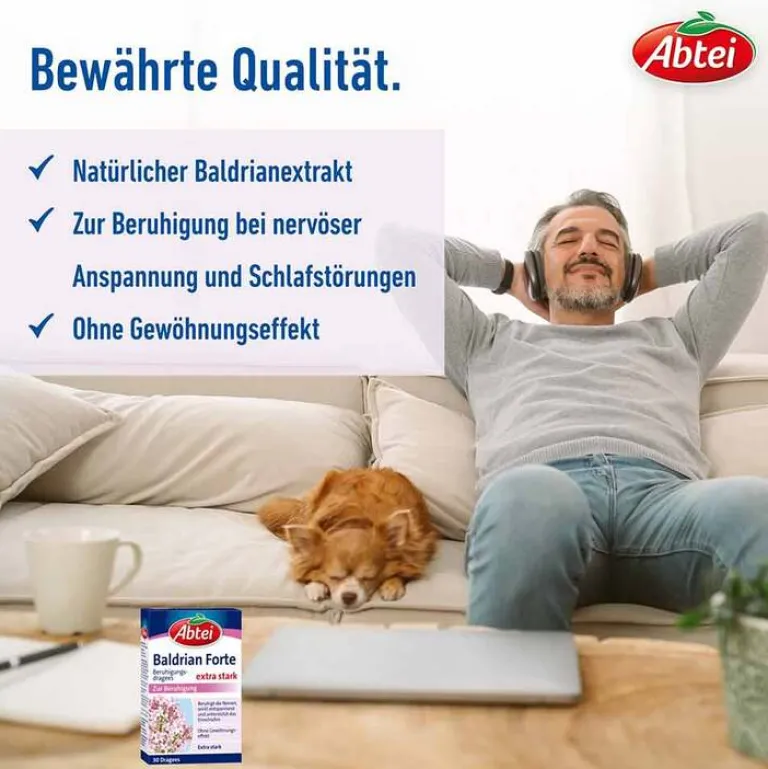 Baldrian Forte Beruhigungsdragees Wirkstoff: Baldrianwurzel-Trockenextrakt Anwendungsgebiete: Pflanzliches Arzneimittel bei leichter nervöser Anspannung und bei Schlafstörungen. Warnhinweise: Dieses Arzneimittel enthält Glucose und Sucrose (Zucker). Packungsbeilage beachten. Zu Risiken und Nebenwirkungen lesen Sie die Packungsbeilage und fragen Sie Ihre Ärztin, Ihren Arzt oder in Ihrer Apotheke. Perrigo Deutschland GmbH, Königstraße 26, DE-70173 Stuttgart Stand: Juni 2023