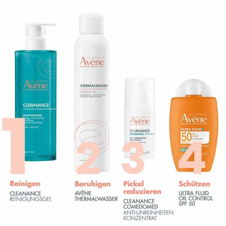Die Avene Cleanance Pflegelinie ist eine ganzheitliche Pflegelinie bei unreiner Haut und Akne. Sie bietet für jedes Akne-Stadium geeignete Reinigungs- und Pflegeprodukte. Einige Produkte sind auch mit anderen Akne-Therapieformen kombinierbar. Von der Reinigung über die Tagespflege bis hin zu einer Maske und punktuellen Behandlungen bietet Cleanance alles, was Ihre Haut benötigt, um rein und gleichzeitig gepflegt und genährt zu sein.
