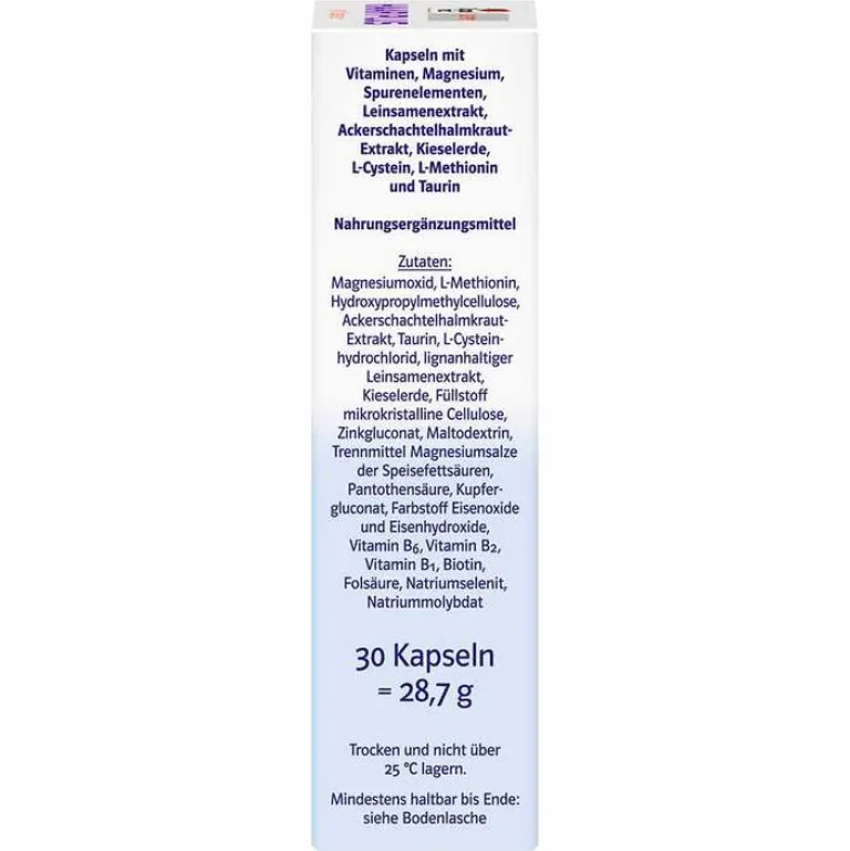 Magnesiumoxid, L-Methionin, Hydroxypropylmethylcellulose, Ackerschachtelhalmkraut-Extrakt, Taurin, L-Cysteinhydrochlorid, lignanhaltiger Leinsamenextrakt, Kieselerde, Füllstoff mikrokristalline Cellulose, Zinkgluconat, Maltodextrin, Trennmittel Magnesiumsalze der Speisefettsäuren, Pantothensäure, Kupfergluconat, Farbstoff Eisenoxide und Eisenhydroxide, Vitamin B6, Vitamin B2, Vitamin B1, Biotin, Folsäure, Natriumselenit, Natriummolybdat.