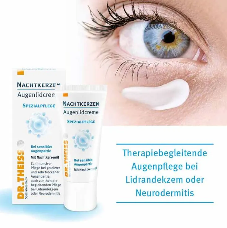 Gerade die Augenpartie ist bei Neurodermitis häufig besonders angegriffen. Neben sehr trockener und gereizter Haut können Lidrandekzeme entstehen. Dr. Theiss Nachtkerzen Augenlidcreme spendet der trockenen Augenpartie mit Panthenol und Glycerin intensiv Feuchtigkeit und regeneriert die Haut. Ein pflanzlicher Komplex wirkt beruhigend und kann Juckreiz lindern.