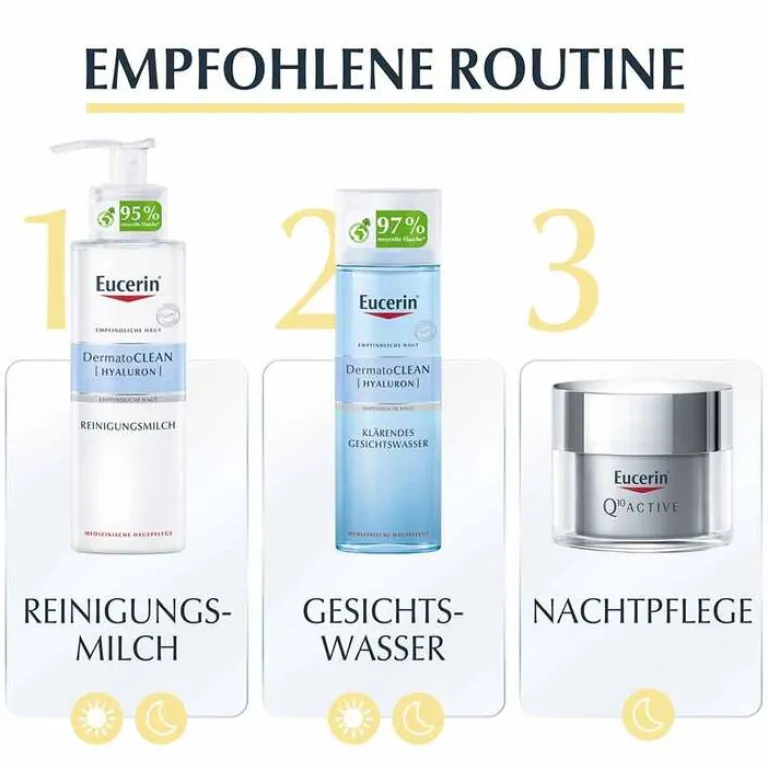 Reinigen: Die Haut mit Eucerin DermatoClean [Hyaluron] Reinigungsmilch reinigen und letzte Make-up-Reste mit Eucerin DermatoClean Augen-Make-Up-Entferner entfernen.