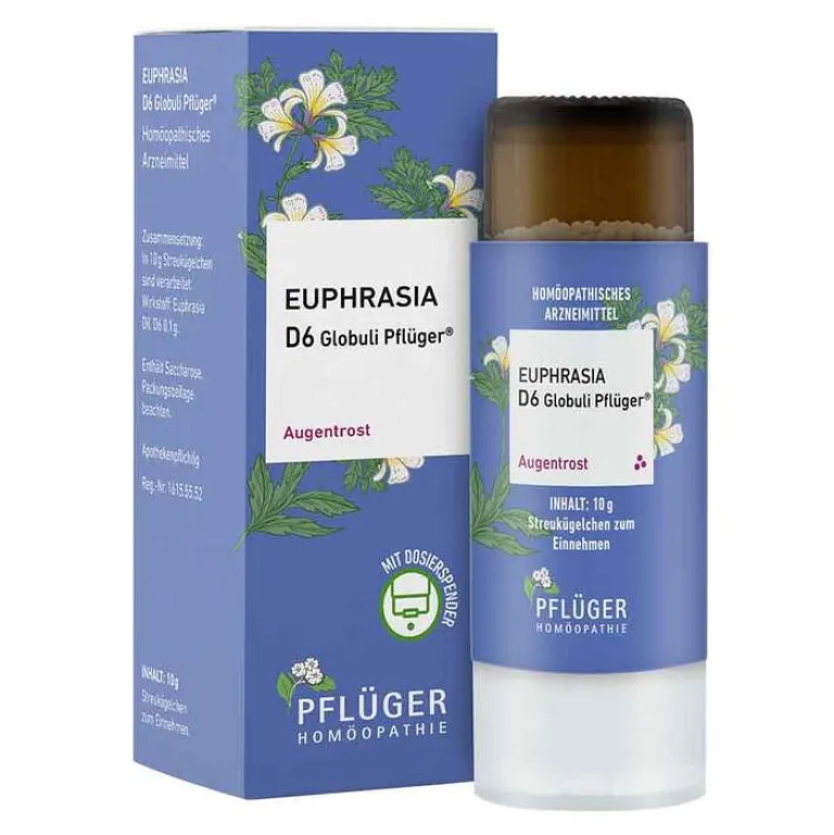 Euphrasia D6 Globuli Pflüger®, Zusammensetzung: In 10 g Streukügelchen sind verarbeitet: Wirkstoff: Euphrasia Dil. D6 0,1 g. Sonstiger Bestandteil: Saccharose. Registriertes homöopathisches Arzneimittel, daher ohne Angabe einer therapeutischen Indikation. Gegenanzeigen / Nebenwirkungen: Keine bekannt. Enthält Saccharose. Packungsbeilage beachten. Zu Risiken und Nebenwirkungen lesen Sie die Packungsbeilage und fragen Sie Ihre Ärztin, Ihren Arzt oder in Ihrer Apotheke. Homöopathisches Laboratorium Alexander Pflüger GmbH & Co. KG 33378 Rheda-Wiedenbrück [email protected] www.pflueger.de