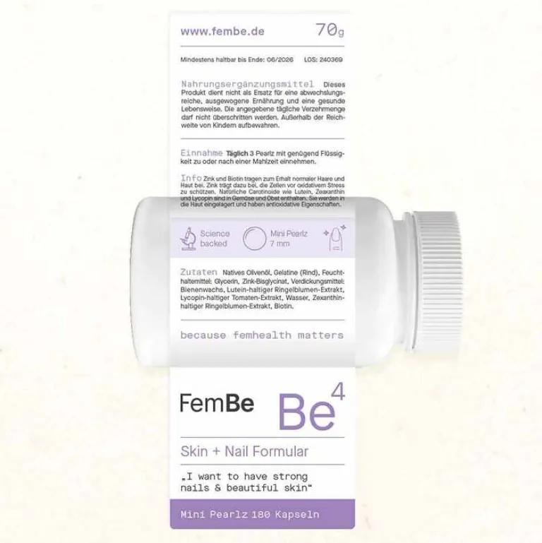 Tägliche Belastungen und Umwelteinflüsse beanspruchen Haut und Nägel. Die FemBe Be4 Skin + Nail Formular kombiniert einen hochwertigen Carotinoid-Komplex mit bioverfügbarem Zink-Bisglycinat und reinem Biotin, um die Haut zu schützen und die Nägel zu stärken. Diese gezielte Nährstoffkombination fördert die Regeneration und trägt zu einem gesunden Erscheinungsbild bei.