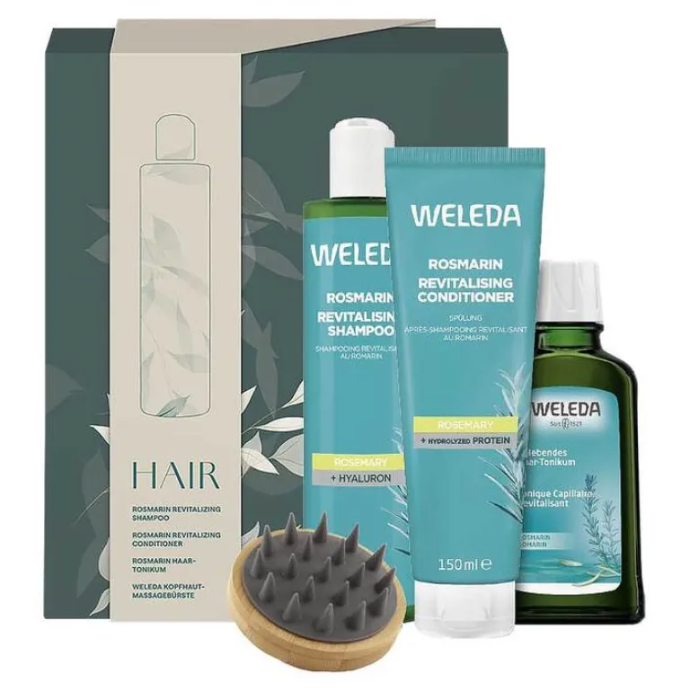 - Geschenkset mit Rosmarin Shampoo, Conditioner und Haar-Tonikum plus gratis Weleda Kopfhaut-Massagebürste