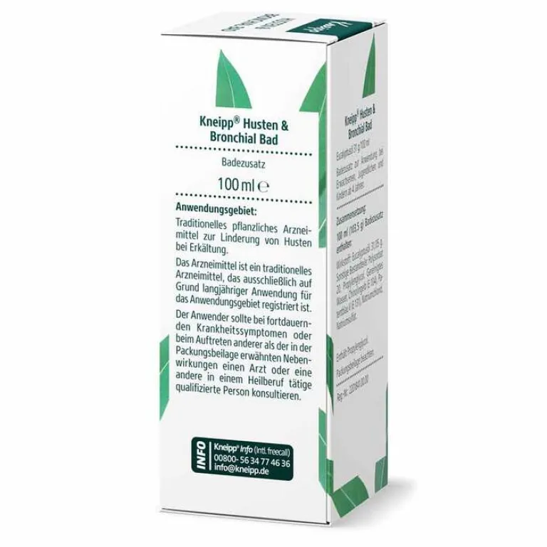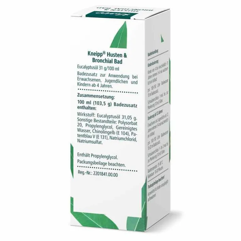 Kneipp® Husten & Bronchial Bad. Wirkstoff: Eucalyptusöl 31,05 g. Badezusatz zur Anwendung bei Erwachsenen, Jugendlichen und Kindern ab 4 Jahren. Traditionelles pflanzliches Arzneimittel zur Linderung von Husten bei Erkältung, ausschließlich auf Grund langjähriger Anwendung. Enthält Propylenglycol. Zu Risiken und Nebenwirkungen lesen Sie die Packungsbeilage und fragen Sie Ihre Ärztin, Ihren Arzt oder in Ihrer Apotheke.