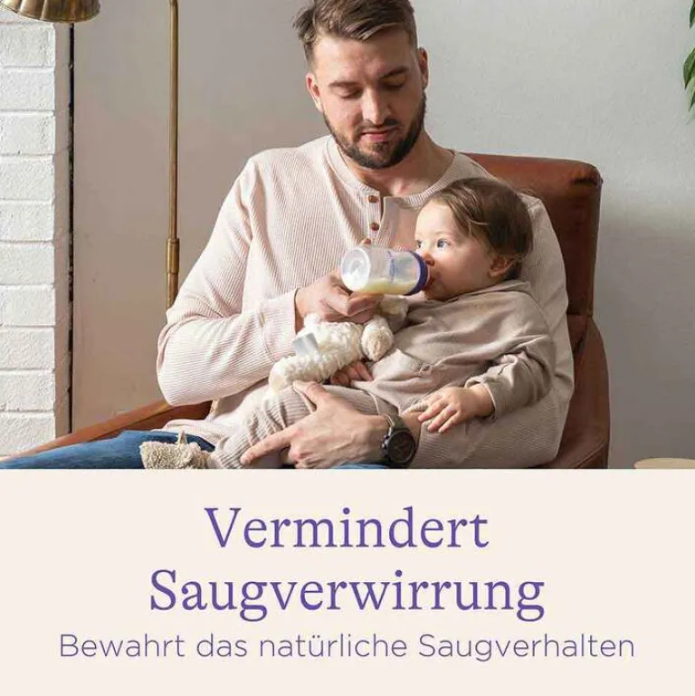 Wenn Sie Stillen und Flasche kombinieren möchten, ist der NaturalWave Sauger die natürliche Antwort. Die verminderte Saugverwirrung ist klinisch bestätigt.* Die breite Saugerbasis mit Antihafttextur macht ein einfaches Anlegen und einen sicheren Mundschluss möglich. Durch die sanfte Neigung des NaturalWave Saugers kann das Baby den Sauger mit aufgestülpten Lippen umschließen.