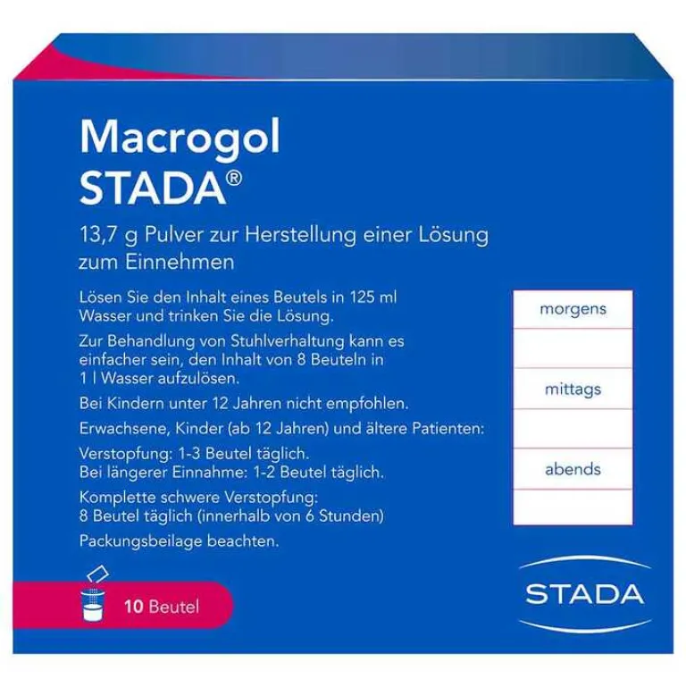- 1–3 x täglich 1 Beutel Macrogol STADA® in 125ml Wasser auflösen und einnehmen