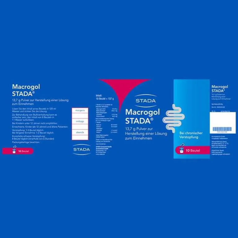Macrogol STADA® 13,7 g Pulver zur Herstellung einer Lösung zum Einnehmen. Wirkstoffe: Macrogol 3350, Natriumchlorid, Natriumhydrogencarbonat, Kaliumchlorid. Abführmittel zur Behandlung der chronischen Verstopfung bei Erwachsenen, Kindern ab 12 Jahren und älteren Patienten. Es verhilft Ihnen zu einer unproblematischen Darmtätigkeit, selbst wenn Sie bereits über einen langen Zeitraum unter Verstopfung gelitten haben. Es wirkt auch bei einer sehr schlimmen Verstopfung, die als Stuhlverhaltung (komplette schwere Verstopfung) bezeichnet wird. Hinweis: Hoher Natriumgehalt. Enthält Kalium. Bei Kindern unter 12 Jahren nicht empfohlen. Zu Risiken und Nebenwirkungen lesen Sie bitte die Packungsbeilage und fragen Sie Ihren Arzt oder Apotheker. STADA Consumer Health Deutschland GmbH, Stadastraße 2–18, 61118 Bad Vilbel. Stand: November 2022