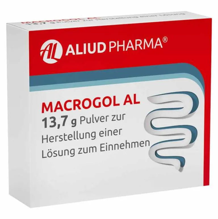 Macrogol AL 13,7 g Pulver zur Herstellung einer Lösung zum Einnehmen Wirkstoffe: Macrogol 3350, Natriumchlorid, Natriumhydrogencarbonat, Kaliumchlorid. Abführmittel zur Behandlung der chronischen Verstopfung bei Erwachsenen, Kindern ab 12 Jahren und älteren Patienten. Es verhilft Ihnen zu einer unproblematischen Darmtätigkeit, selbst wenn Sie bereits über einen langen Zeitraum unter Verstopfung gelitten haben. Es wirkt auch bei einer sehr schlimmen Verstopfung, die als Stuhlverhaltung (komplette schwere Verstopfung) bezeichnet wird. Hinweis: Hoher Natriumgehalt. Enthält Kalium. Bei Kindern unter 12 Jahren nicht empfohlen. Zu Risiken und Nebenwirkungen lesen Sie die Packungsbeilage und fragen Sie Ihre Ärztin, Ihren Arzt oder in Ihrer Apotheke. ALIUD PHARMA GmbH, Postfach 1380, 89146 Laichingen Stand: April 2022