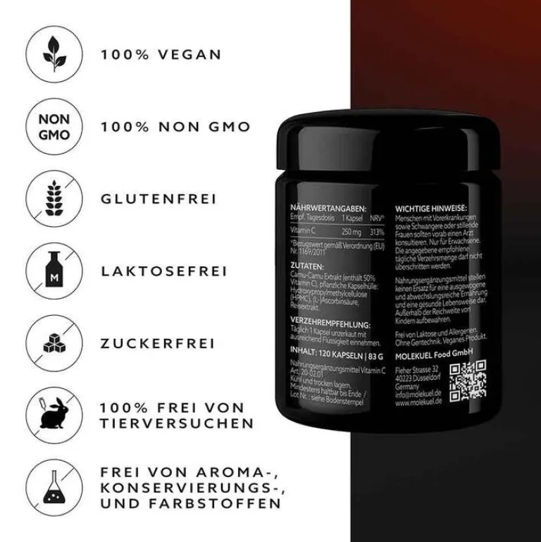 Der hochkonzentrierte Vitamin C-Komplex wurde in Deutschland zusammen mit Experten nach höchsten Standards entwickelt. Die ausgewogene Formel liefert Ihnen 250 mg Vitamin C pro Tagesdosis (1 Kapsel). Mit jedem Produkt erhalten Sie einen 4-Monatsvorrat (120 Kapseln).