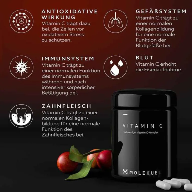 ¹ Vitamin C trägt zu einer normalen Funktion des Immunsystems während und nach intensiver körperlicher Betätigung bei. Vitamin C trägt dazu bei, die Zellen vor oxidativem Stress zu schützen. Vitamin C erhöht die Eisenaufnahme. Vitamin C trägt zu einer normalen Kollagenbildung für eine normale Funktion der Blutgefäße bei. Vitamin C trägt zu einer normalen Kollagenbildung für eine normale Funktion des Zahnfleisches bei.