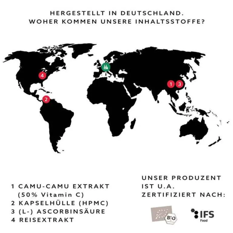 Camu-Camu Extrakt (enthält 50% Vitamin C), pflanzliche Kapselhülle: Hydroxypropylmethylcellulose (HPMC), (L-Ascorbinsäure, Reisextrakt.
