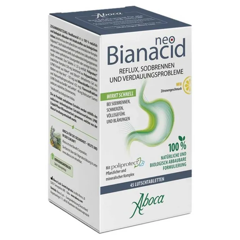 NeoBianacid ist ein speziell entwickeltes Produkt, das Sodbrennen lindert und gleichzeitig die Schleimhaut des Magens und der Speiseröhre schützt. Es enthält Poliprotect – einen Molekülkomplex mit mucoadhäsiven Eigenschaften. Diese Eigenschaften ermöglichen es, eine Schutzbarriere auf der Schleimhaut zu bilden, die sie vor Magensäure und anderen reizenden Substanzen schützt. NeoBianacid ist als Lutschtablette erhältlich und enthält Mineralien (Kalkstein und Nahkolit), Polysaccharide aus Aloe Vera, Malve und Eibisch sowie Flavonoide aus Kamille und Süßholz.