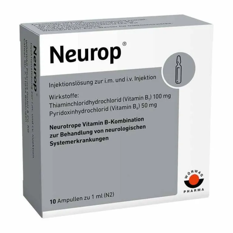 Neurop®. Wirkstoffe: Thiaminchloridhydrochlorid (Vitamin B1) 100 mg, Pyridoxinhydrochlorid (Vitamin B6) 50 mg. Anwendungsgebiete: B-Vitaminmangel (Neurolog. Systemerkrankungen durch nachgewiesenen Mangel an Vitamin B1 u. B6). Zu Risiken und Nebenwirkungen lesen Sie die Packungsbeilage und fragen Sie Ihre Ärztin, Ihren Arzt oder in Ihrer Apotheke. Wörwag Pharma GmbH & Co. KG, 71034 Böblingen