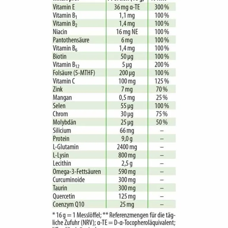 Reisprotein, Erbsenprotein, Sonnenblumenlecithin (15,6 %), Kürbisprotein, L-Glutamin (12,5 %), Leinöl, L-Lysinhydrochlorid (3,9 %), Kokosmehl, Kurkuma-Extrakt (2 %), Taurin, Kieselerde, Sophora japonica-Extrakt, Vitamin C, stark tocopherolhaltige Extrakte (Vitamin E natürlichen Ursprungs), Zinkgluconat, Coenzym Q10 (0,2 %), Niacin, Pantothensäure, Pfefferminzöl, Mangangluconat, Vitamin B6, Vitamin B1, Vitamin B2, bioaktive Folsäure (5MTHF-Glucosamin), Chrom-(III)-Chlorid, Natriumselenat, Natriummolybdat, Biotin, Vitamin B12 (Methylcobalamin).
