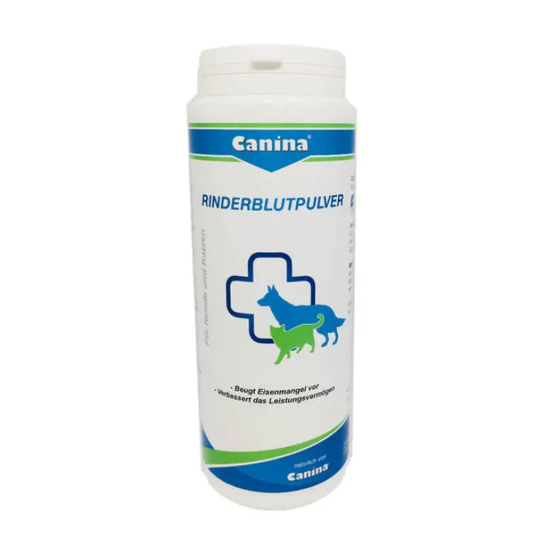 Einzelfuttermittel für Hunde und Katzen Canina Rinderblutpulver ist ein wertvoller Spender des roten Blutfarbstoffes (Hämoglobin), welcher als Zentralatom das Eisen in sich trägt, das den Blutsauerstoff transportiert. Weitere von Natur aus enthaltene Mineralstoffe im Rinderblutpulver sind Kalzium, Phosphor, Natrium, Kalium, Magnesium, Kupfer, Mangan und Zink. Außerdem enthält Rinderblut Eiweiße, die wiederum aus Aminosäuren bestehen, die für den Aufbau der Erbsubstanz in jeder einzelnen Körperzelle benötigt werden.