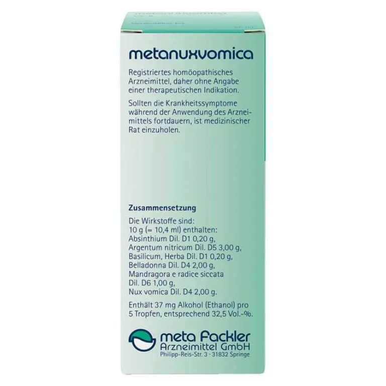 metanuxvomica Mischung.Anwendungsgebiete: Registriertes homöopathisches Arzneimittel, daher ohne Angabe einer therapeutischen Indikation. Enthält 37 mg Alkohol (Ethanol) pro 5 Tropfen, entsprechend 32,5 Vol.-%. Zu Risiken und Nebenwirkungen lesen Sie die Packungsbeilage und fragen Sie Ihre Ärztin, Ihren Arzt oder in Ihrer Apotheke. meta Fackler Arzneimittel GmbH, D-31832 Springe.