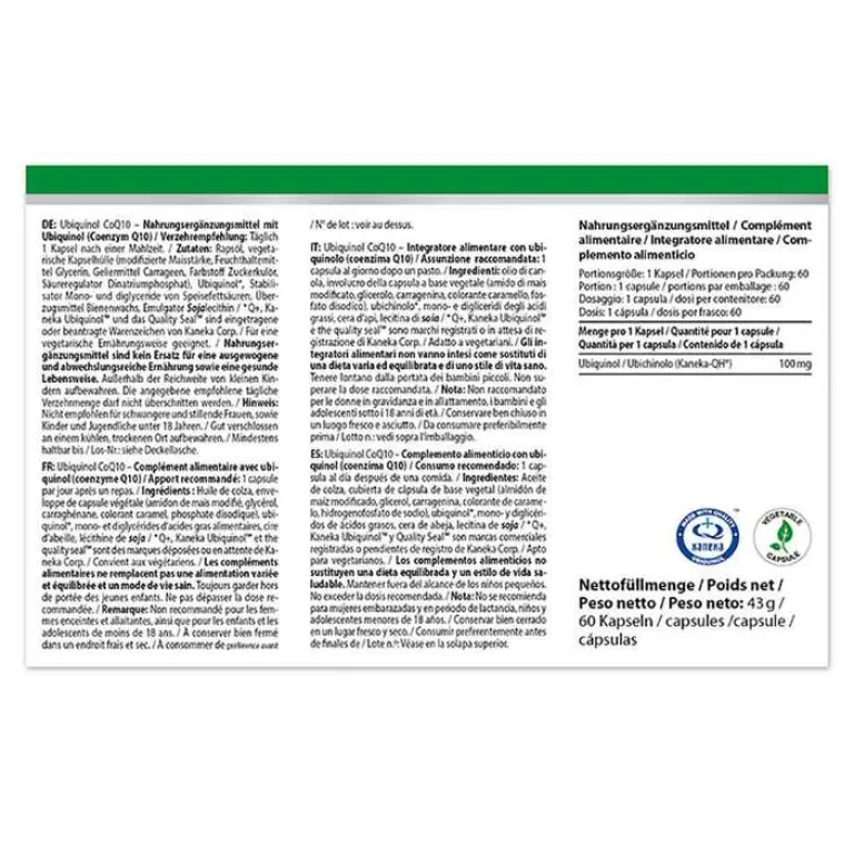 Rapsöl, vegetarische Kapselhülle (modifizierte Maisstärke, Feuchthaltemittel Glycerin, Geliermittel Carrageen, Farbstoff Zuckerkulör, Säureregulator Dinatriumphosphat), Ubiquinol*, Stabilisator Mono- und diglyceride von Speisefettsäuren, Überzugsmittel Bienenwachs, Emulgator Sojalecithin