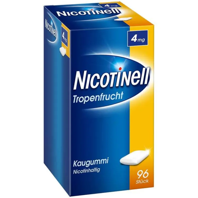 NICOTINELL Kaugummi Tropenfrucht 4 mg. Wirkstoff: Nicotin. Anwendungsgebiete: Zur Linderung von Nicotinentzugssymptomen, zur Unterstützung der Raucherentwöhnung bei Nicotinabhängigkeit. Raucher, die zurzeit nicht in der Lage sind, sofort mit dem Rauchen vollständig aufzuhören, können NICOTINELL Kaugummi zunächst zur Verringerung ihres Zigarettenkonsums (Rauchreduktion) verwenden, um auf diesem Wege den Einstieg in den Rauchausstieg zu erreichen. Die Stärke zu 4 mg ist angezeigt, wenn es zu schweren Entzugserscheinungen kommt. Eine Beratung und Betreuung des Patienten erhöhen in der Regel die Erfolgsraten. Warnhinweis: Enthält Levomenthol, Sorbitol (Ph.Eur.), Mannitol (Ph.Eur.), Xylitol, Natriumverbindungen und Butylhydroxytoluol (Ph.Eur.). Apothekenpflichtig. Stand: 03/2019. Zu Risiken und Nebenwirkungen lesen Sie die Packungsbeilage und fragen Sie Ihre Ärztin, Ihren Arzt oder in Ihrer Apotheke.