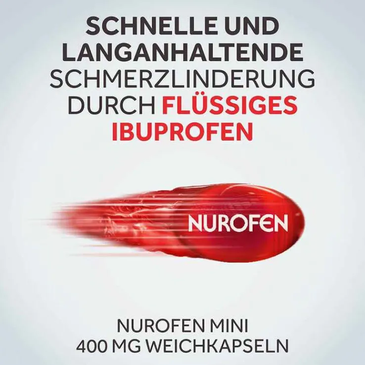 Der flüssige Kern der NUROFEN® MINI Weichkapseln enthält 400 mg des Wirkstoffs Ibuprofen und kann zur Behandlung von leichten bis mäßig starken Schmerzen wie akuten Kopfschmerzen, Spannungskopfschmerzen, Regelschmerzen, Zahnschmerzen sowie Schmerzen und Fieber im Zusammenhang mit Erkältungen und grippalen Infekten eingesetzt werden.