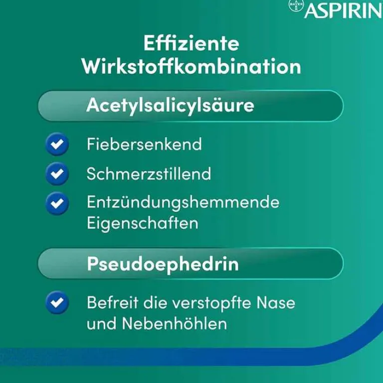 Aspirin® Complex Granulat-Sticks 500 mg/30 mg Wirkstoffe: Acetylsalicylsäure, Pseudoephedrinhydrochlorid Anwendungsgebiete: Zur symptomatischen Behandlung bei verstopfter Nase bzw. Nasennebenhöhlen (Rhinosinusitis) mit Schmerzen und Fieber im Zusammenhang mit Erkältungs- und/oder grippeähnlichen Symptomen. Hinweis: Enthält Isomalt und Benzylalkohol. Packungsbeilage beachten. Ohne ärztlichen Rat nicht länger anwenden als in der Packungsbeilage vorgegeben! Zu Risiken und Nebenwirkungen lesen Sie die Packungsbeilage und fragen Sie Ihre Ärztin, Ihren Arzt oder in Ihrer Apotheke. Bayer Vital GmbH, 51368 Leverkusen, Deutschland