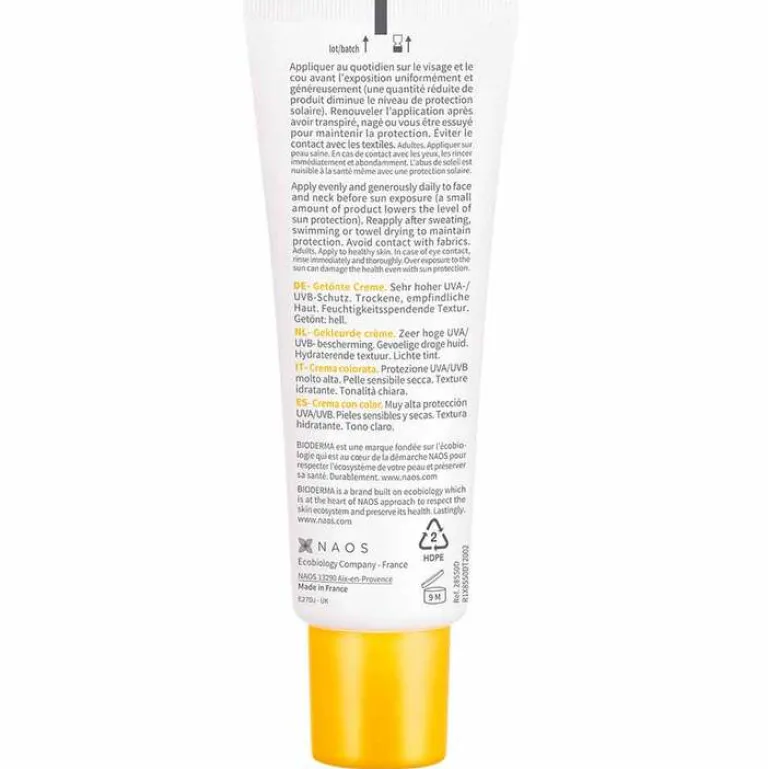 Bioderma Photoderm Creme LSF 50+ getönt ist eine Sonnenschutzpflege mit sehr hohem UVA/UVB-Schutz für empfindliche, trockene Haut. Die cremige, leichte Textur spendet 8 Stunden lang Feuchtigkeit und hinterlässt weder ein öliges Finish noch weiße Spuren.