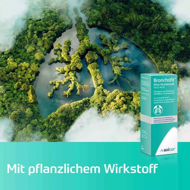 Bronchofit® Efeu-Hustensaft 0,87 g/ 100 ml Flüssigkeit zum Einnehmen. Wirkstoff: Efeublätter-Trockenextrakt. Anwendungsgebiete: Pflanzliches Arzneimittel zur Anwendung als schleimlösendes Mittel bei produktivem Husten. Enthält Fructose, Benzoesäure/-benzoat und Propylenglycol. Packungsbeilage beachten. Zu Risiken und Nebenwirkungen lesen Sie die Packungsbeilage und fragen Sie Ihre Ärztin, Ihren Arzt oder in Ihrer Apotheke. axicorp Pharma GmbH, 61381 Friedrichsdorf. Stand: August 2023